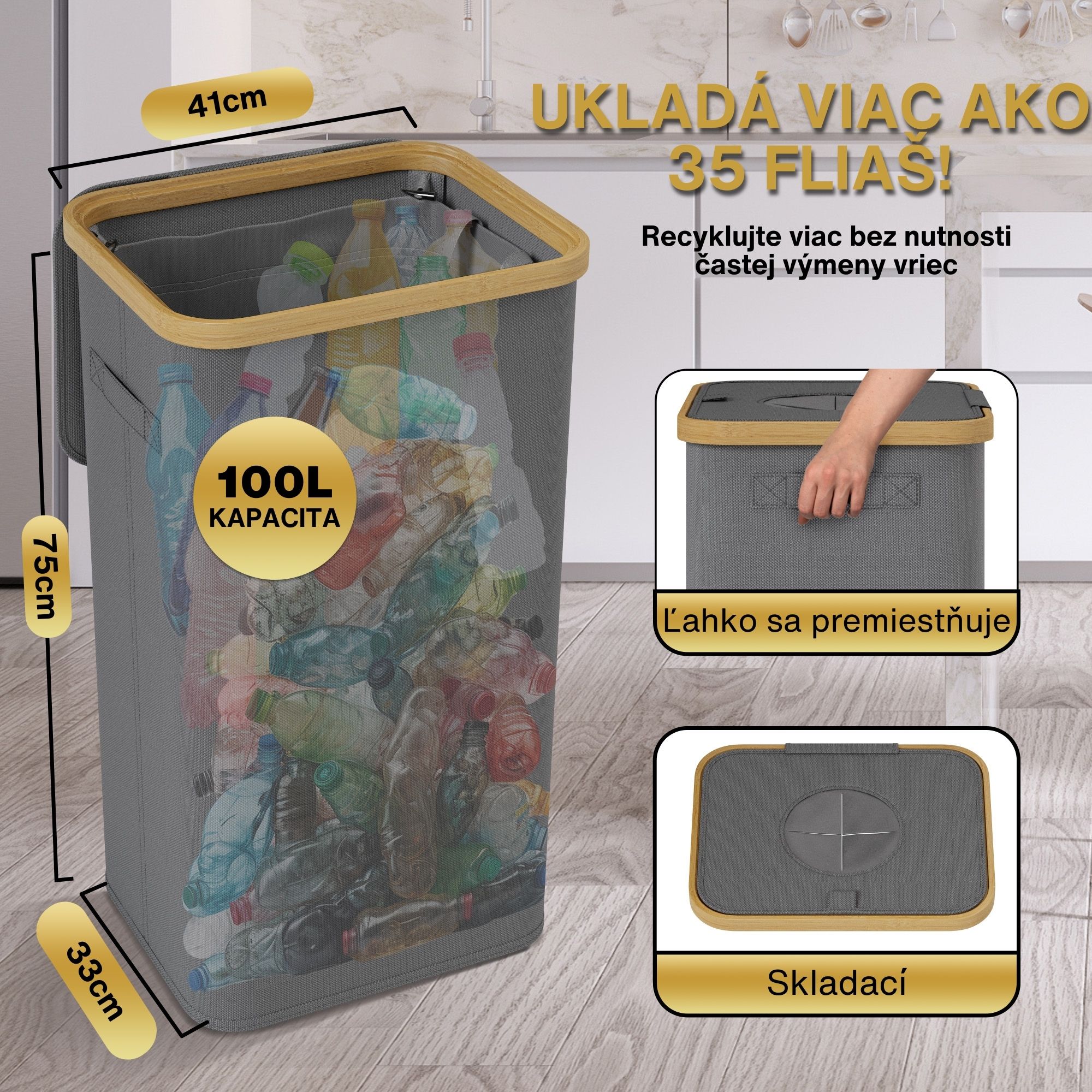 - KAPACITA 100L: Poskytuje dostatok priestoru na veľké množstvo recyklovateľného materiálu, od skla až po plast. Vnútorné vrecko umožňuje jednoduché vyberanie, čistenie a organizáciu.